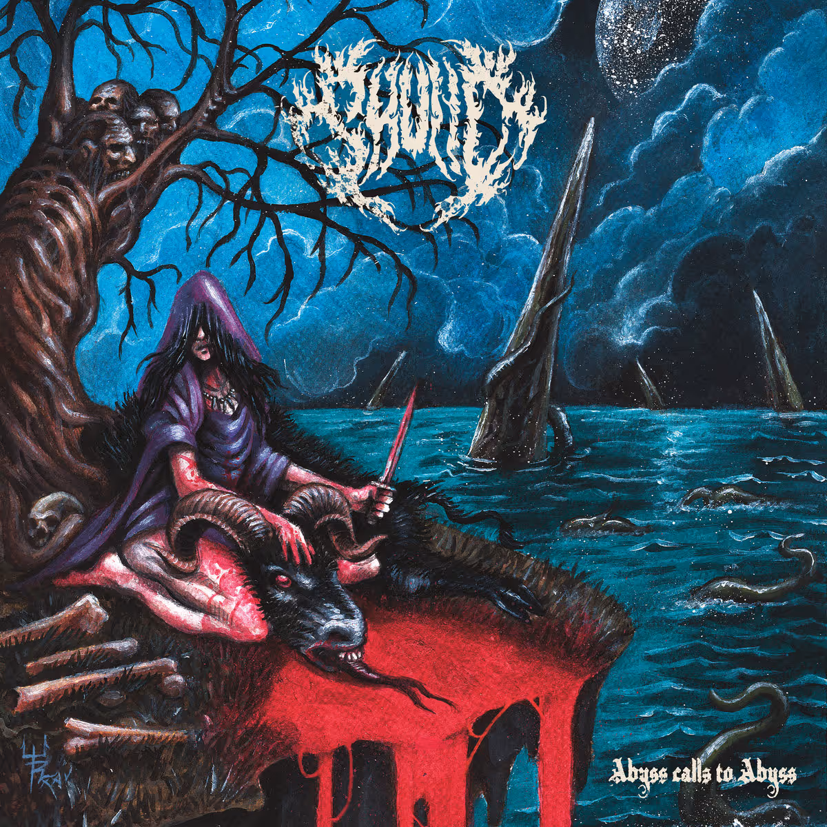 Le rituel est rutilant, tranchant comme le poignard qui décapita le démon mâle qui voilait ma jeunesse, violait mes nuits, empêchait ma chute vers d’inavouables et délectables noirceurs. J’ai alors vociféré et supplié tant et tant, avec une force primale et désespérée, que les abysses m’engloutirent finalement. D’un nul-être, je devins Skulld. Je suis aujourd’hui une force païenne libérée de tout joug tyrannique. Dans ma féminité, je porte l’obscurité cosmique et la diffuse en arythmiques rythmiques. Abyss Call To Abyss est ma litanique plainte, et sous mon regard brûlent les scélérats apeurés, ceux qui, fuyant la révolte de l’esprit, redoutant la mort et détestant l’égalité des sexes n’auraient jamais osé s’engouffrer dans un puit de ténèbres.