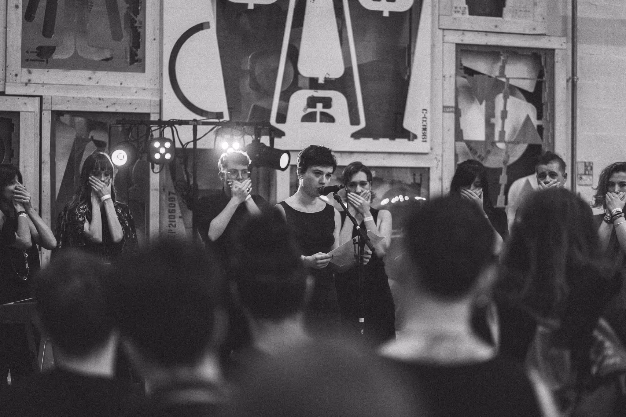 Dans l’ancienne halle industrielle vibre une étrange harmonie corrodée. Comme un magma d’émotions transperçant la croûte du trauma, Lorsque les volcans dorment entrouvre l'édifice. En équilibre sur de fines montées instrumentales, les visages et les voix se succèdent et s’agrègent dans une même quête revendicatrice, celle d’une survivance dans la singularité, d’un courage unifié par de grimaçantes réalités.